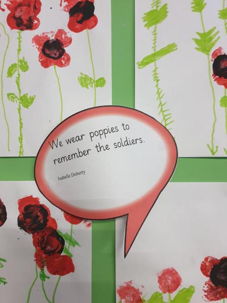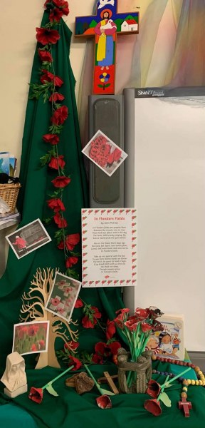 Remembrance Day is usually observed at St James’ Catholic Primary School with a beautiful Remembrance Service in the school hall including a minutes silence, appropriate readings and prayers and the Last Post, usually played by one of our own brass teachers. It is always a beautiful and moving occasion and we are always surrounded by our poppy based art work.