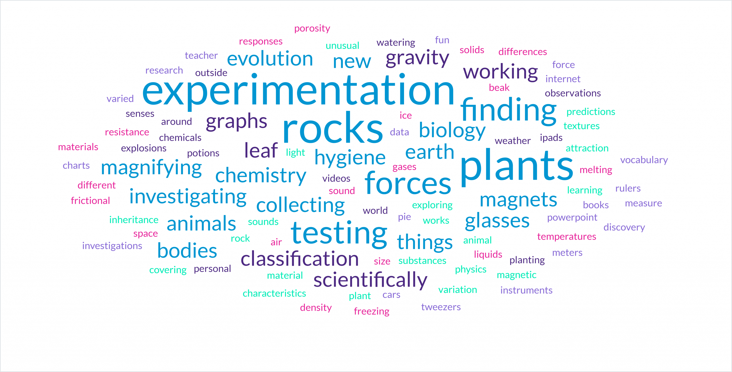 This is all done through planning different types of scientific enquiries to answer questions, recognising and controlling variables where necessary. We use increasing accuracy and precision to take measurements using a range of scientific equipment, and record data and results of increasing complexity using scientific diagrams and labels, classification keys, tables, scatter graphs, bar and line graphs. We use test results to make predictions to set up further comparative and fair tests, and report and present findings in a variety of ways.